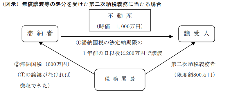 滞納者が無償譲渡等の処分をし、このため滞納者の国税を徴収することができないこととなった場合には、次のいずれの要件にも該当するときには、その第三者に対して第二次納税義務が負わせられます(国税徴収法第39条)。