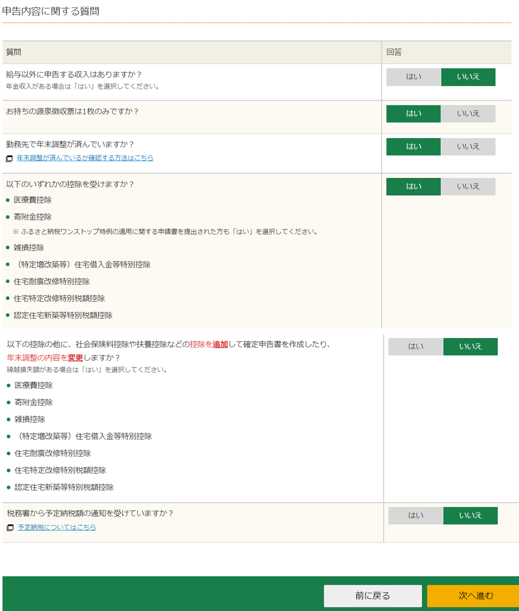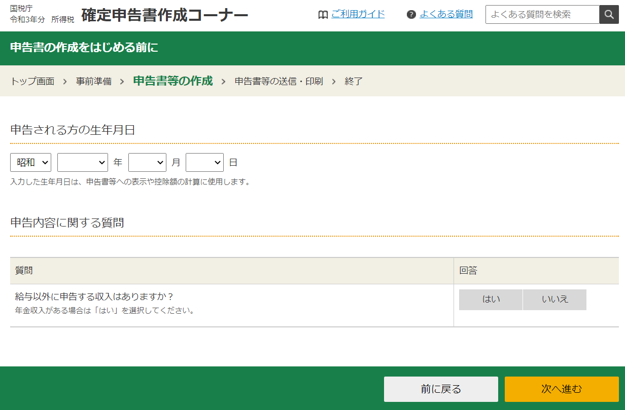 次の画面では生年月日を入力する他、どんな目的で申告するのかについて答えます。一つ答えると次々と質問が登場します。