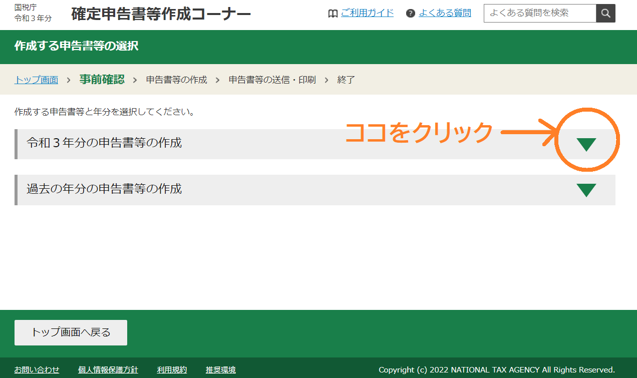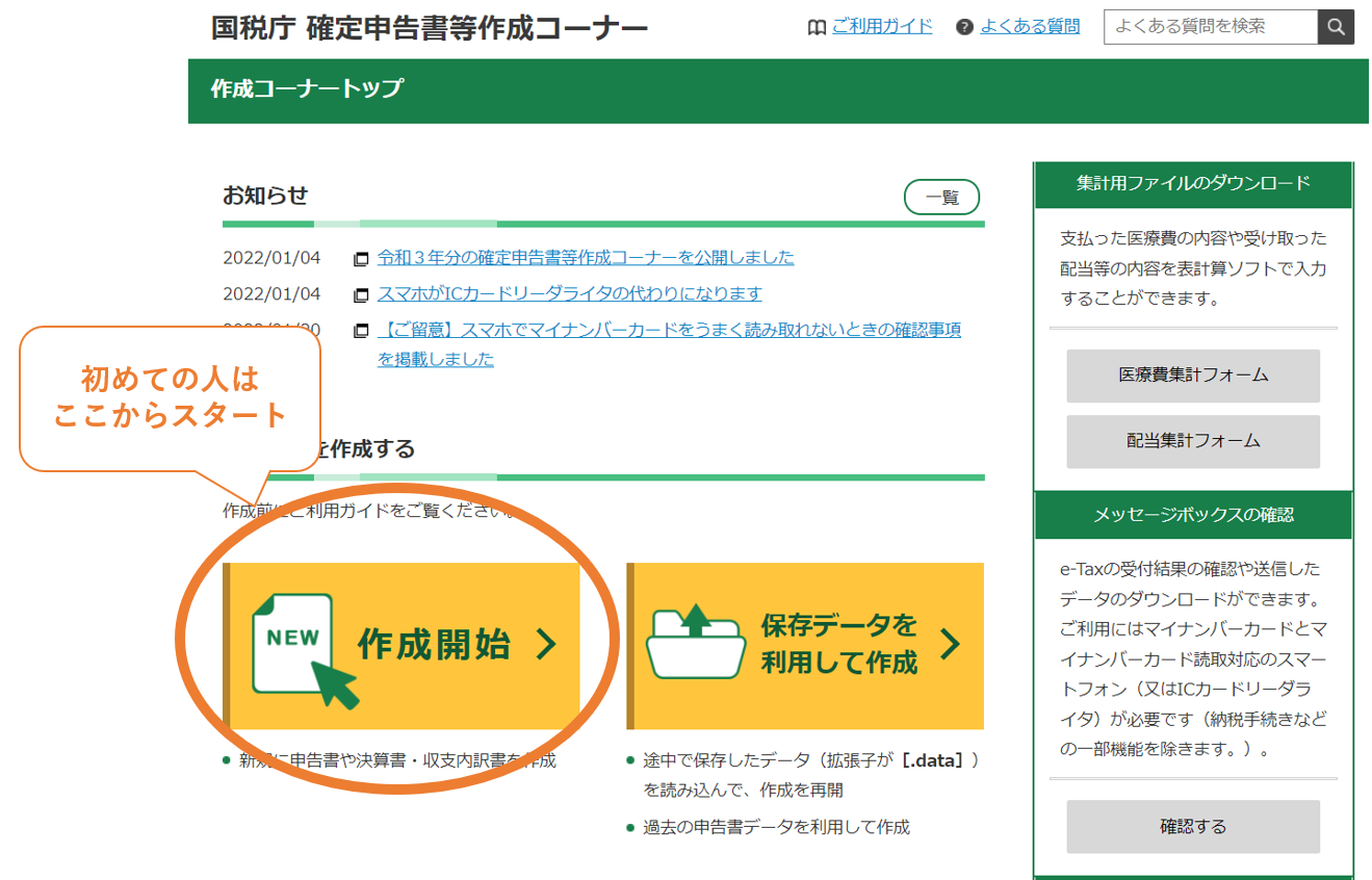 1.「確定申告書等作成コーナー」を開き、「作成開始」をクリック