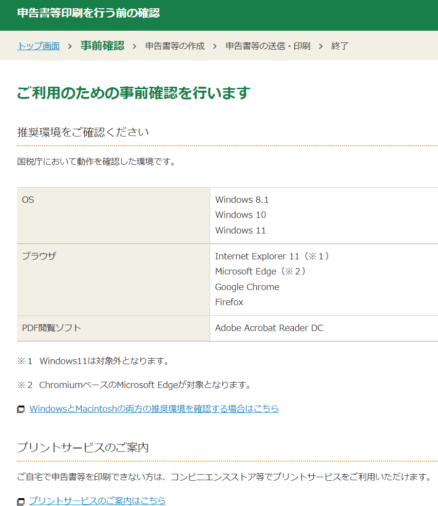 次の画面では「ホームページで申告書を作成できる環境にあるか」を確認します。お手持ちのPCの条件が合うことが確認できたら次に進みます。