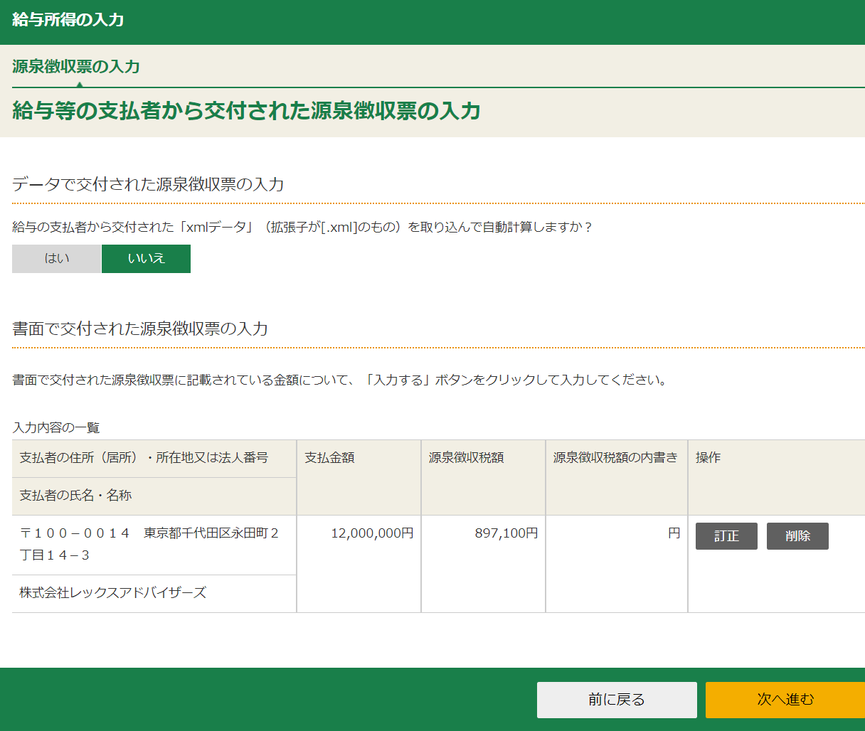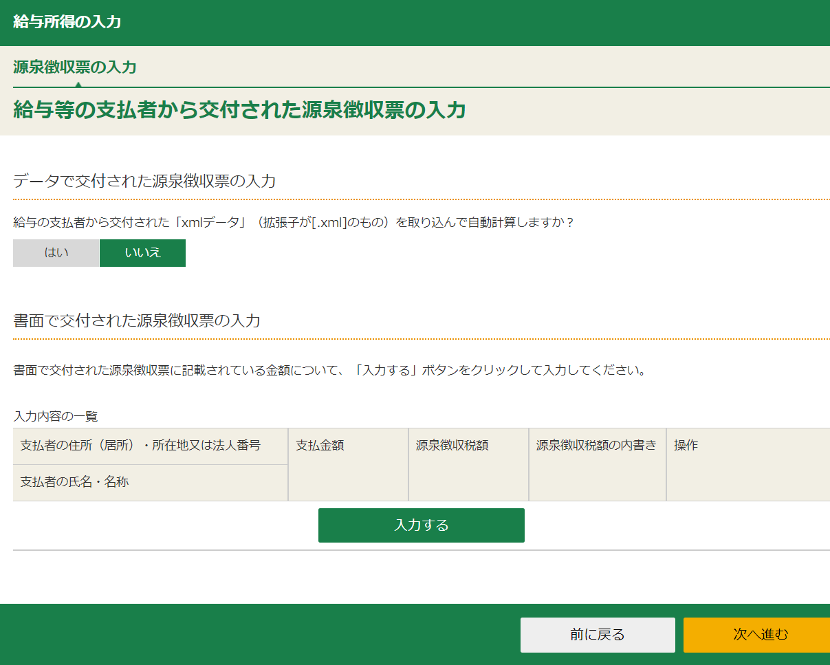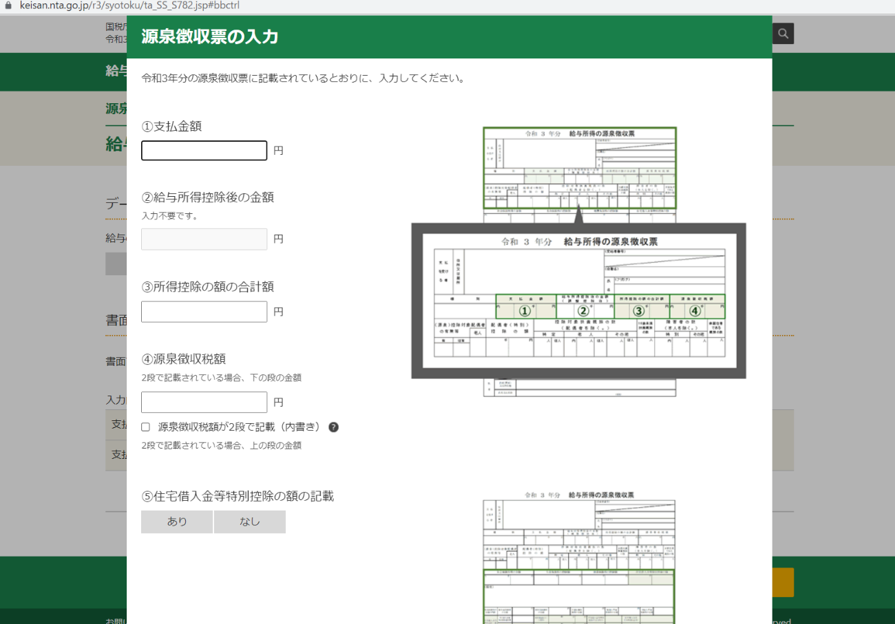【初心者向け】確定申告は国税庁のホームページでできる!「確定申告書等作成コーナー」解説 公開日: 2022.01.26更新日: 2023.05.17 鈴木まゆ子 控除国税国税庁e-Tax TwitterFacebookHatenaLINE 6.給与所得の情報を源泉徴収票から入力 給与所得の情報を入力するページに進みます。 最初の問いで「自動計算をしない」を選択し、源泉徴収票の入力コーナーで「入力する」を選ぶと、次の画面が登場します。 ここで、会社からもらった給与所得の源泉徴収票を見ながら入力していきます。次のようなイメージです。 「入力内容の確認」をクリックすると、次のような確認画面に移ります。 内容が合っていれば、次に進みます。 次のページ7.医療費控除を入力 1 2 3 4 5 6 7