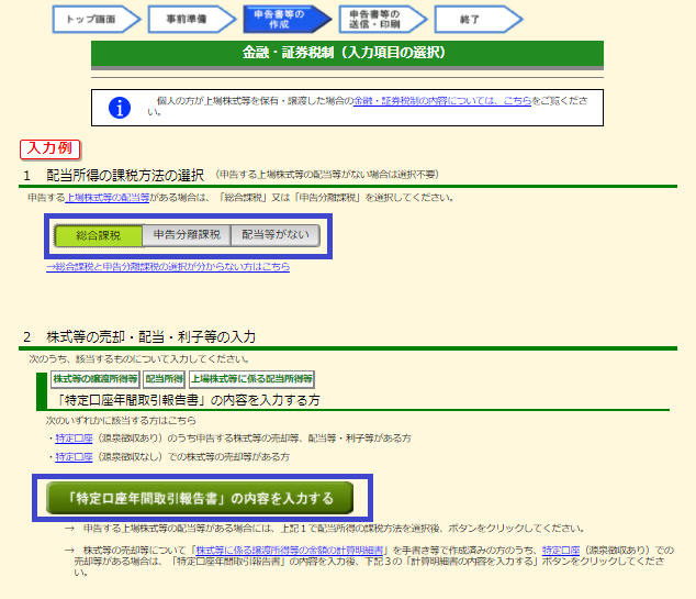 「配当所得課税方法の選択」で、「総合課税」「申告分離課税」「配当等がない」を選択します。