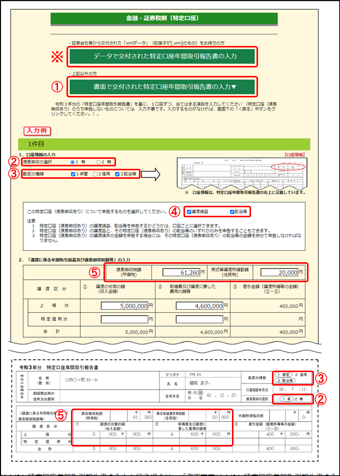 ① 書面で交付された特定口座年間取引報告書の入力を行う場合は、「書面で交付された特定口座年間取引報告書の入力」ボタンをクリックしてください。
