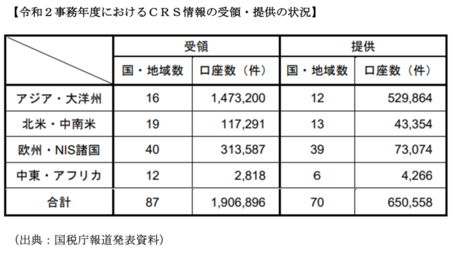 国税庁によると、令和2事務年度では、日本の個人や法人が海外に保有する金融口座情報約191万件(口座残高12.6兆円)を87か国・地域の外国税務当局から受領しました。