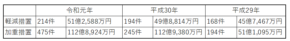 令和2年分における軽減・加重措置をみると、令和2事務年度における所得税及び相続税の実地調査の結果、軽減措置を受けた件数は126件(増差所得等金額43億3960万円)、加重措置を受けたのは307件(増差所得等金額88億792万円)となり、126件が調書を出したものの申告漏れがあったことになる。
