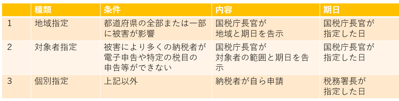 個別延長とは、国税通則法第11条に定める期限延長の一つです。地震や豪雨といった自然災害や火災や交通途絶といった人為的な災害、国税庁のシステムダウンなどで、本来の期限までに申告や申請、届出といった手続きができなくなったときに発動します。期限延長には、次の3つがあります。