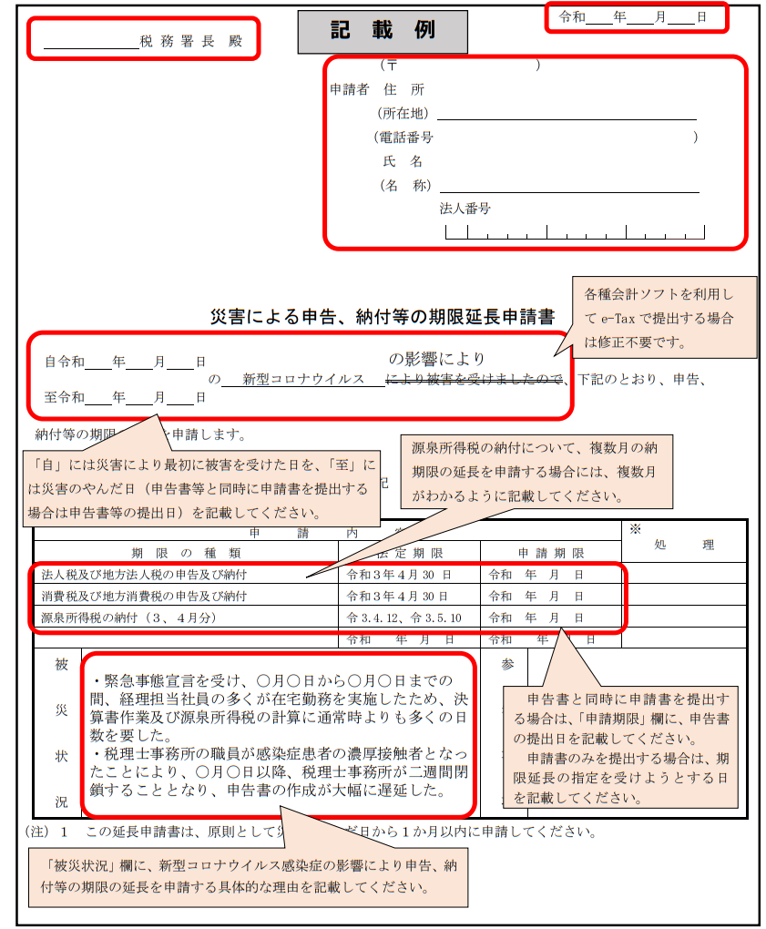 記載例を見てみましょう。こちらは法人の法人税、消費税、源泉所得税の個別延長の申請です。書き方は次のようになります。