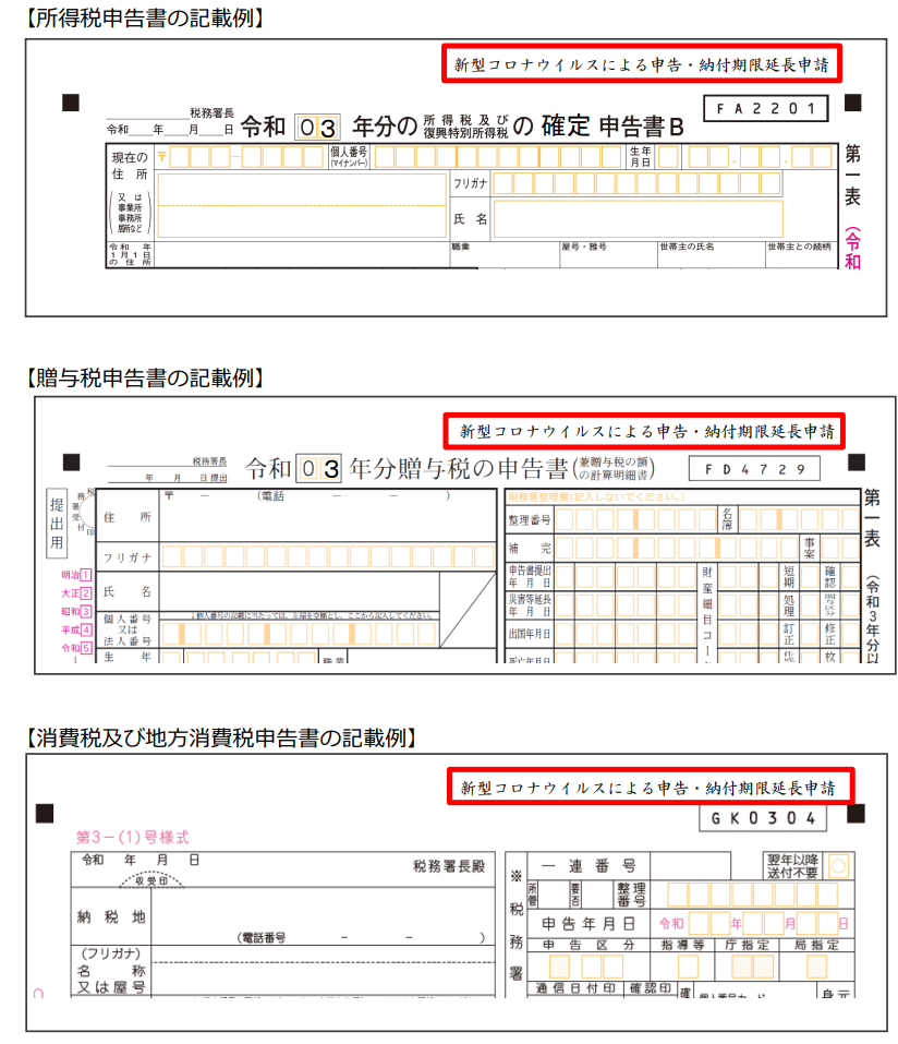 確定申告書に「新型コロナウイルスによる申告・納付期限延長申請」と一言書けば十分です。紙の申告書は次のように書きます。