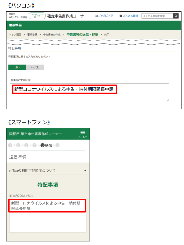 e-taxなら送信準備画面の特記事項の欄に、延長申請の旨を記載します。