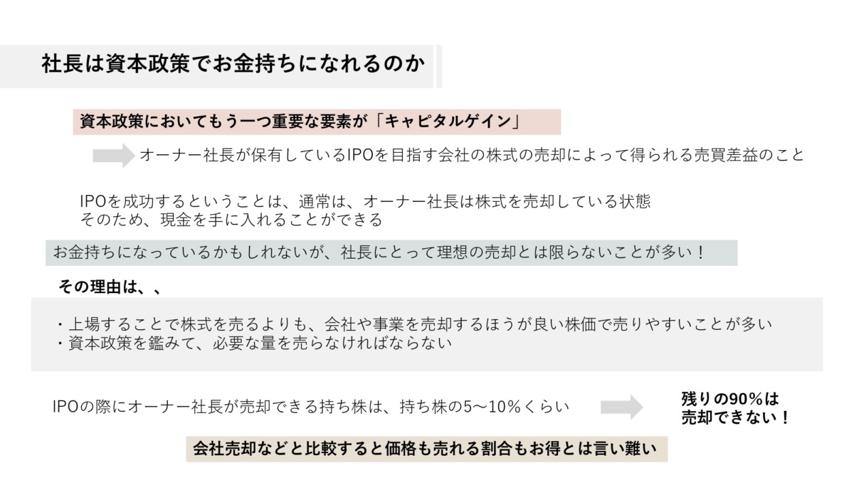 資本政策においてもう一つ重要な要素があります。「キャピタルゲイン」です。ここでいうキャピタルゲインとは、オーナー社長が保有しているIPOを目指す会社の株式の売却によって得られる売買差益を指すこととします。社長はIPOをすると儲かるというイメージはここから来ています。