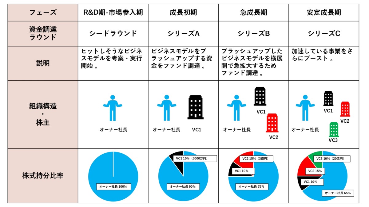 資本政策はIPO成功実現時の株式売却だけではありません。現況の資本からIPOする際までの資本の動きすべてを計画立てます。上記の表のように理解するとわかりやすいですね。