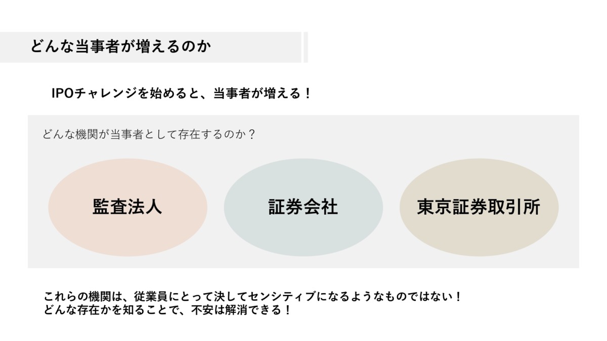 IPOチャレンジを始めるとこれまで聞き慣れなかった存在をよく耳にするようになるでしょう。「監査法人」、「証券会社」、「東京証券取引所」。実際のところは何をしているのかよくわからないという方も多いのではないでしょうか。さらに突然対応が求められるなど、取り調べを受けるような億劫な気持ちになったりはしていませんか。実際チェックする立場の存在達なのでテキトーな対応をするわけにはいきませんが、従業員の立場から対応する場合、センシティブになるような相手ではないのです。少なくとも追求して詰め寄る存在ではありませんのでご安心ください。怖いと感じてしまったとしたら、何を求められていて、どのように対応したらよいのか、その範囲を理解できていないからでしょう。どんな存在か少し知るだけで不安を解消できますよ。
