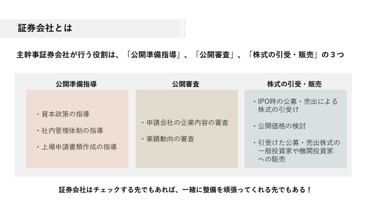 いわゆる主幹事証券会社が行う役割は、「公開準備指導」、「公開審査」、「株式の引受・販売」の3つです。