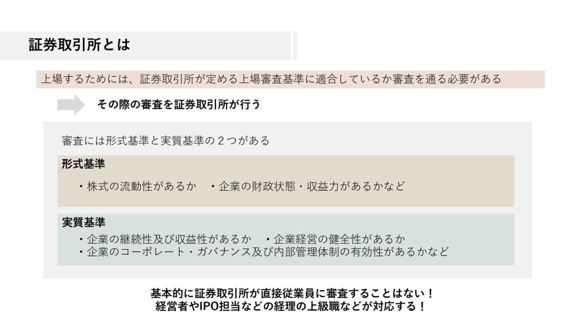 上場するためには、証券取引所が定める上場審査基準に適合しているか審査を通る必要があります。審査は証券取引所が行います。