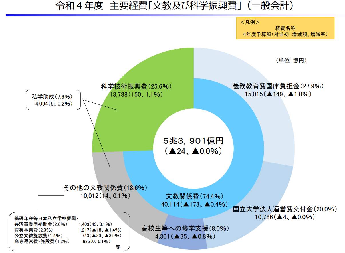 高校生への就学支援、大学の運営費や私立の学校の助成金、科学技術の研究費もあります。