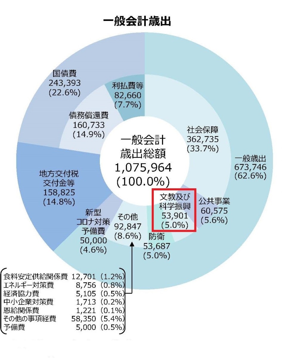 前回の記事でお伝えした社会保障関連費に比べると少ないですが、毎年変わらず5兆円超のお金が国から教育や研究に投じられています。