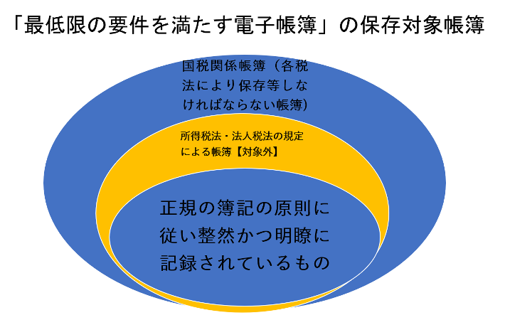「最低限の要件を満たす電子帳簿」の保存対象となる帳簿は、各税法で保存義務が課されている帳簿のうち所得税法又は法人税法の規定により備付け及び保存をしなければならない帳簿については、正規の簿記の原則(法人の場合には複式簿記の原則)に従い、整然と、かつ、明瞭に記録されているものに限定されました。
