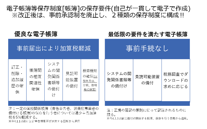 改正電子帳簿保存法(以下、改正電帳法)では、電子による帳簿保存制度は、「優良な電子帳簿」と「最低限の要件を満たす電子帳簿」の2種類で構成されることになりました。