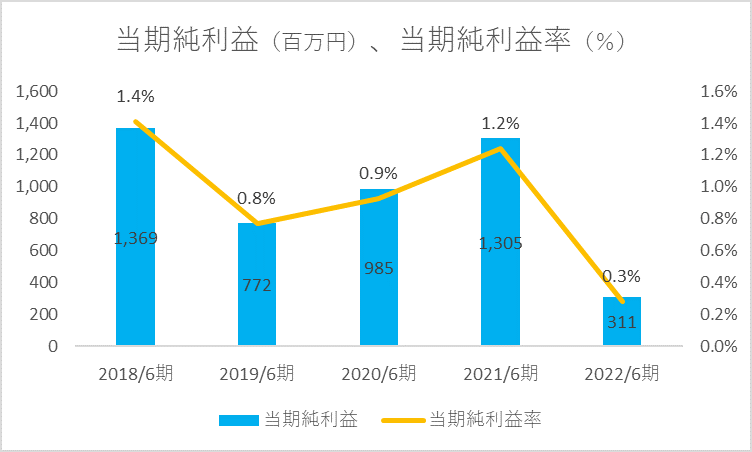 2022年度の当期純利益は3億円、当期純利益率は0.3%となり、前期比10億円減少(△76.2%)と大幅な減益決算となっています。