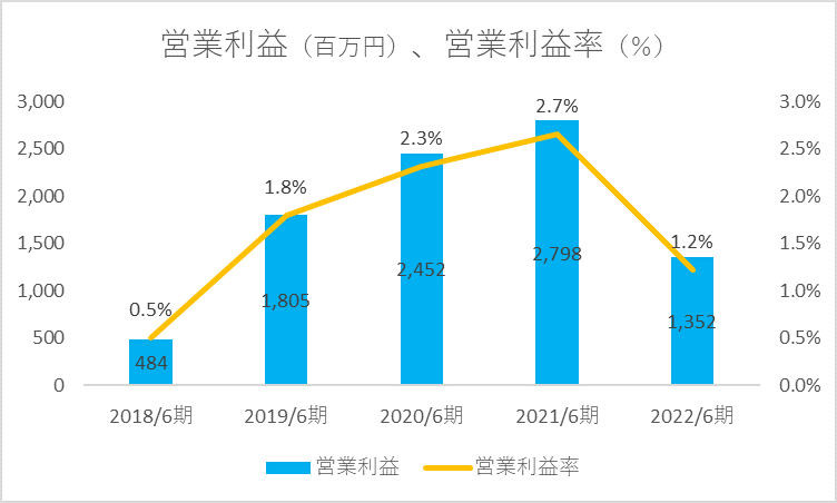 また営業利益率は前期の2.7%から半減した1.2%となっており、ここ5期でみると4番目に低くなっています。