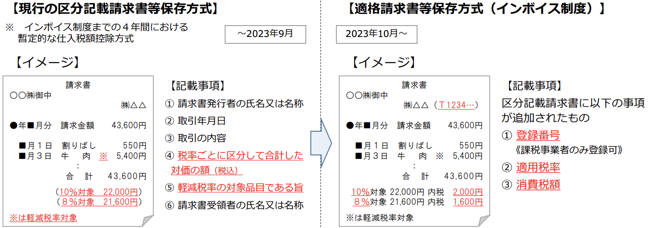 インボイス制度が開始される2023年10月1日からは、区分記載請求書等保存方式ではなく、適格請求書等保存方式に基づいて請求書などを発行する必要があります。