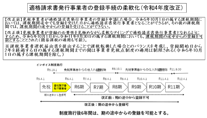 免税事業者が登録の必要性を見極めながら柔軟に適格請求書発行事業者となれるようにするため、令和5年10月1日から令和11年9月30日の属する課税期間においては、課税期間の途中からの登録を可能とする経過措置が令和4年度改正で講じられています。
