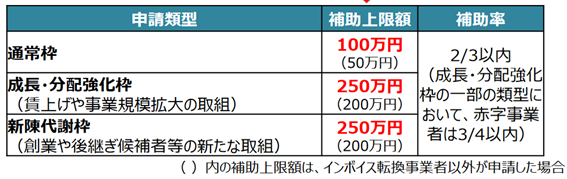 持続化補助金の各種申請枠ごとの補助増減額及び補助率は以下になります。
