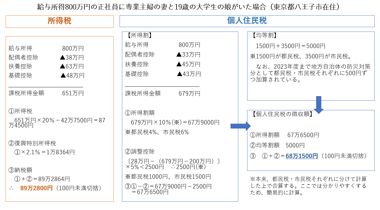 ま「給与所得800万円の人で所得税と住民税、どれくらい税額の差があるかを見てみようか。専業主婦と19歳の子どもがいる前提にしよう」