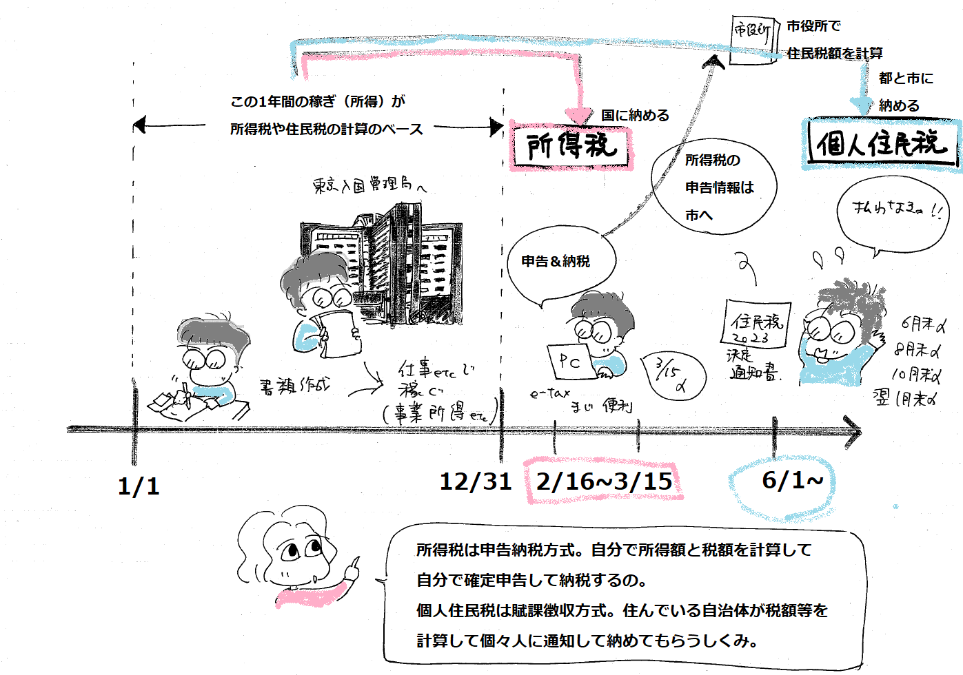 ま「住民税も所得税と同じ所得をベースに計算されるんだよ。でも、納税の時期が所得税より3カ月以上遅い。だから痛税感があるのかも」