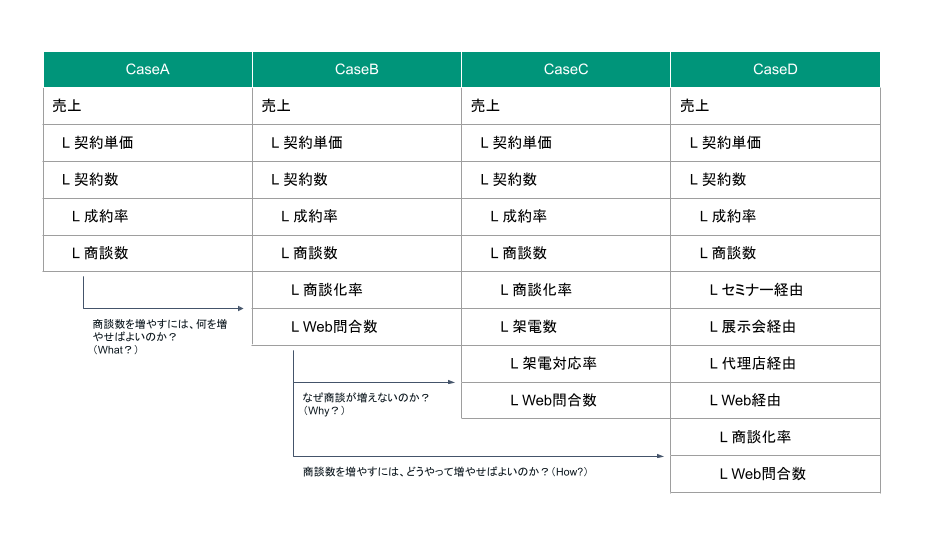また、同じくCaseBからさらに細分化するにあたって、「商談数を増やすには、どうやって増やせばよいのか? (How?)」を考えてみます。