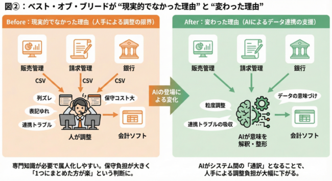 例えば、販売管理ソフトでは「得意先」、会計ソフトでは「補助科目」となっていても、AIが「これは同じA社のことですね」と判断してつないでくれるなど、柔軟に吸収できる可能性があります。